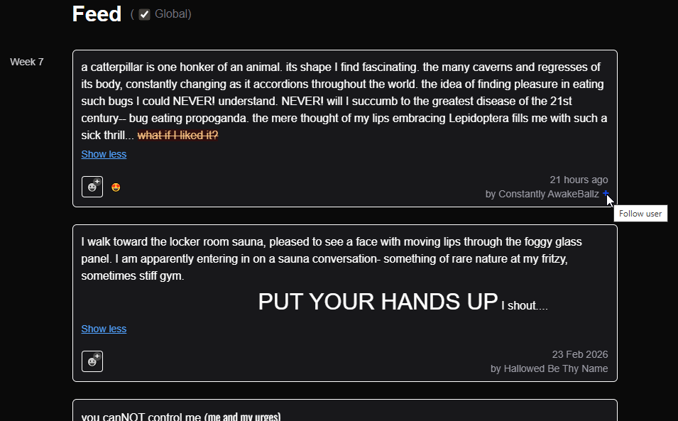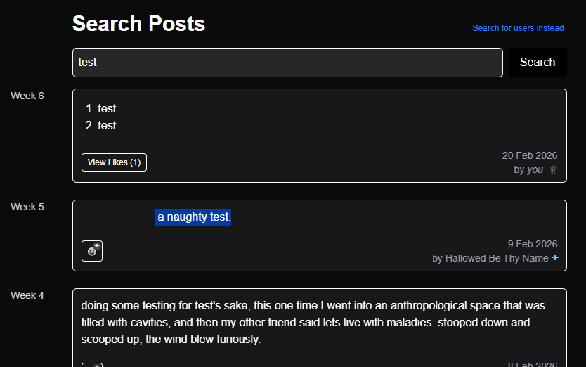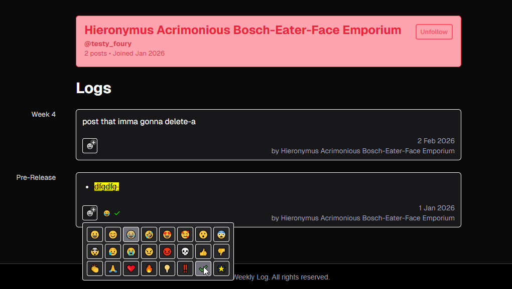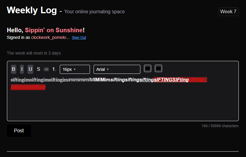 Weekly Log is a minimalistic social media website designed for you to do journaling, creative writing, venting/screaming, ASCII art, gratefulness exercises, or whatever rich text-based content you see fit.