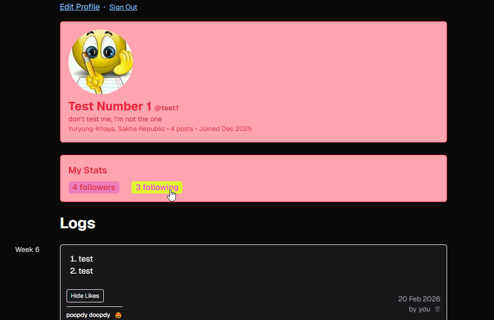 These pages are used to view your and other users' profiles. On your profile, you will also be able to see your followers/following, and edit profile information such as a profile picture and bio.